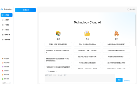 technology cloud是一个集对话聊天,ai辅组工具,ai提示词生成,文生图片为一体的一站式ai工具网站,可以快速的完成论文写作,工作总结等多种文案,还可以生成思维导图,拓展学习途径,兼容pc端浏览器,手机浏览器等,方便国内用户使用